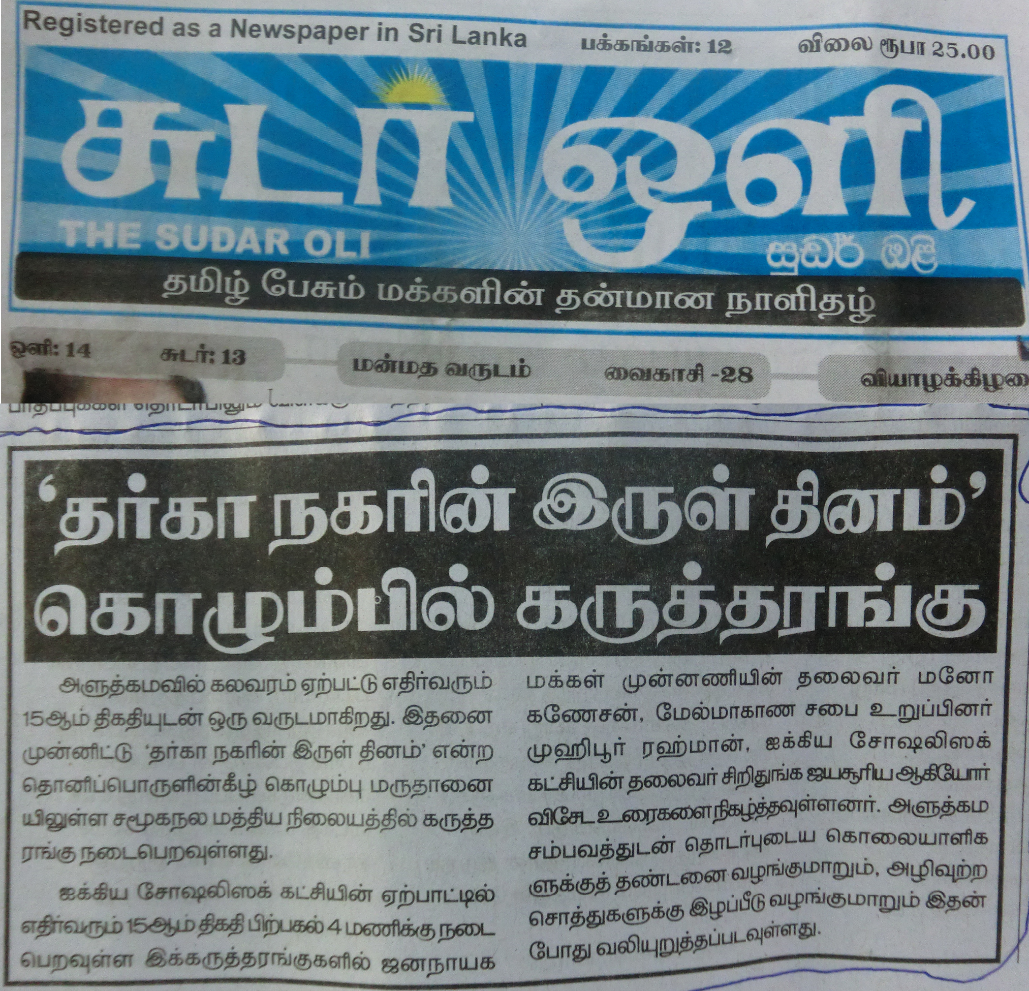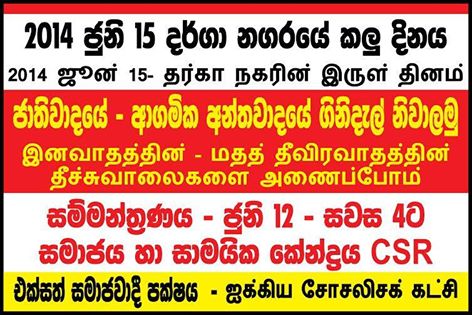 2014 ජුනි 15 දර්ගා නගරයේ කලූ dනය වෙනුවෙන් නැවතත් ජාතිවාදී හා ආගම්වාදී ගිනිදැල් නිවාලිම උදෙසා සමාජ කtකාවක් එක්සත් සමාජවාදී පක්ෂය විසින් ජුනි මස 12 වැනි දින මරදාන සමාජය හා සාමයික කේනද්රයේ දී පැවැත්...
